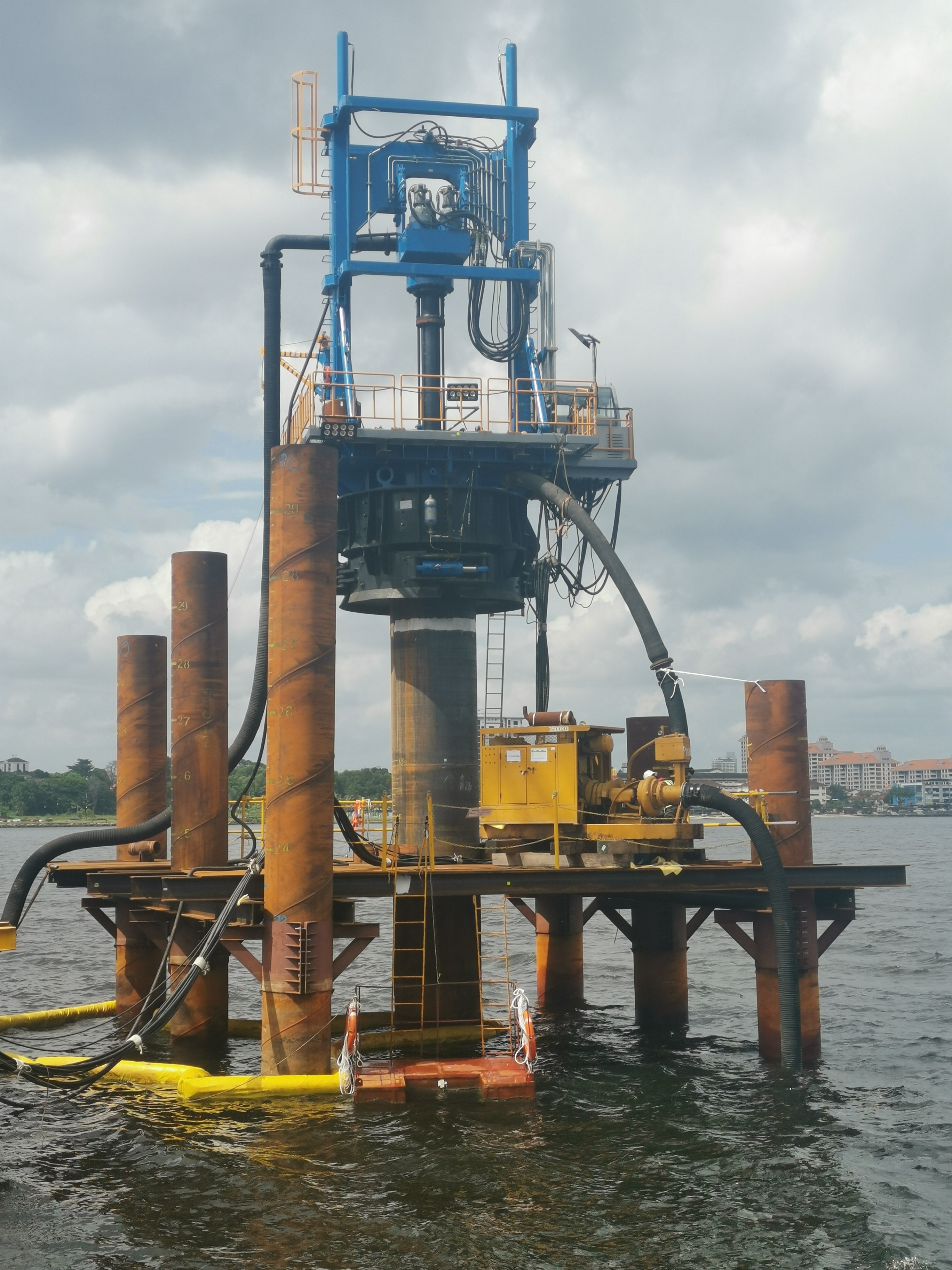 2016年3月我公司承擔了在舟山-秀山島附近我國第一座(世界單機最大容量)3.4兆瓦”潮流發電總成平臺“樁基(包括直樁、斜樁)嵌巖樁施工。在此工程中我們克服了流急(每秒-5m)、漩渦等自然條件,成功地在海底中風化裸巖上進行了準確無誤的施工。